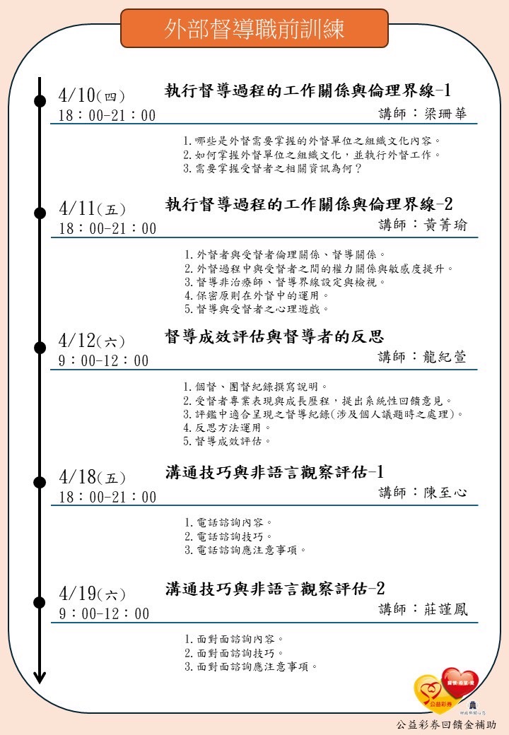 - 備註|參與「督導成效評估與督導者的反思」場次者請先提供目前使用的個督或團督紀錄版本至twsrs04@gmail.com信箱,上傳時刪除可辨識之個人資訊,並於報名表中授權給講師作為教學參考之用。